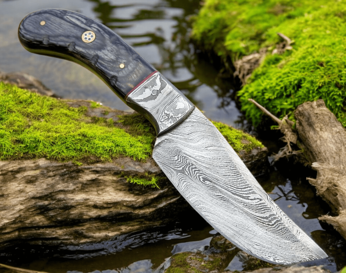 Forged from high-carbon Damascus steel, the blade offers superior edge retention, toughness, and a mesmerizing raindrop texture. The Damascus Blade design adds precision and utility for skinning, field dressing, and other backcountry tasks. The long sweeping edge provides versatility for both slicing and heavy-duty cutting.